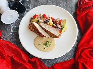 П Стейк из куриной грудки с обжаренными овощами и сливочным соусом