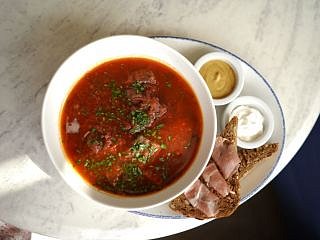 Состав: лук репчатый, морковь, капуста свежая, свекла, картофель, чеснок, укроп, мясо говядины, хлеб ржаной, сало, лук зеленый, сметана, горчица, томатная паста.