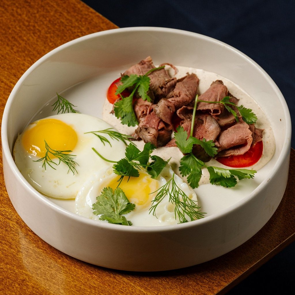 Голень баранины, приготовленная методом су-вид, глазируется соусом Деми-гляссе, медом, горчицей и подается с обжаренными овощами- баклажан, кабачок, болгарский перец, помидоры. В состав входит уксус винный и украшается кинзой