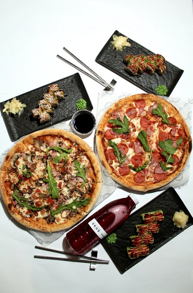 Состав: фирменный томатный соус, сыр моцарелла, мидии, креветки, кальмары, лосось, икра красная, сливки, перец болгарский, руккола