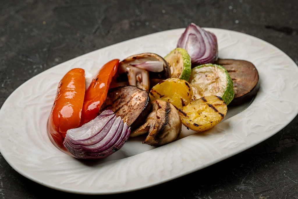 Голень баранины, приготовленная методом су-вид, глазируется соусом Деми-гляссе, медом, горчицей и подается с обжаренными овощами- баклажан, кабачок, болгарский перец, помидоры. В состав входит уксус винный и украшается кинзой