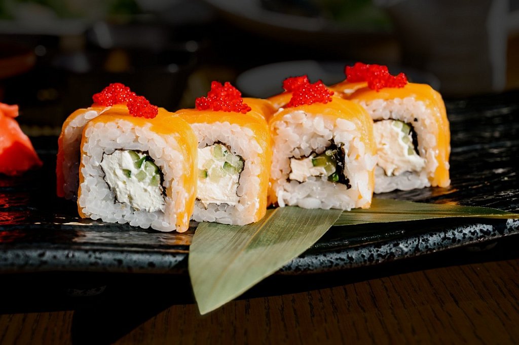 Состав: нори жареный в кляре, рис, сыр творожный, огурец, креветка, соус унаги, кунжут, икра тобико красная, лист бамбука.