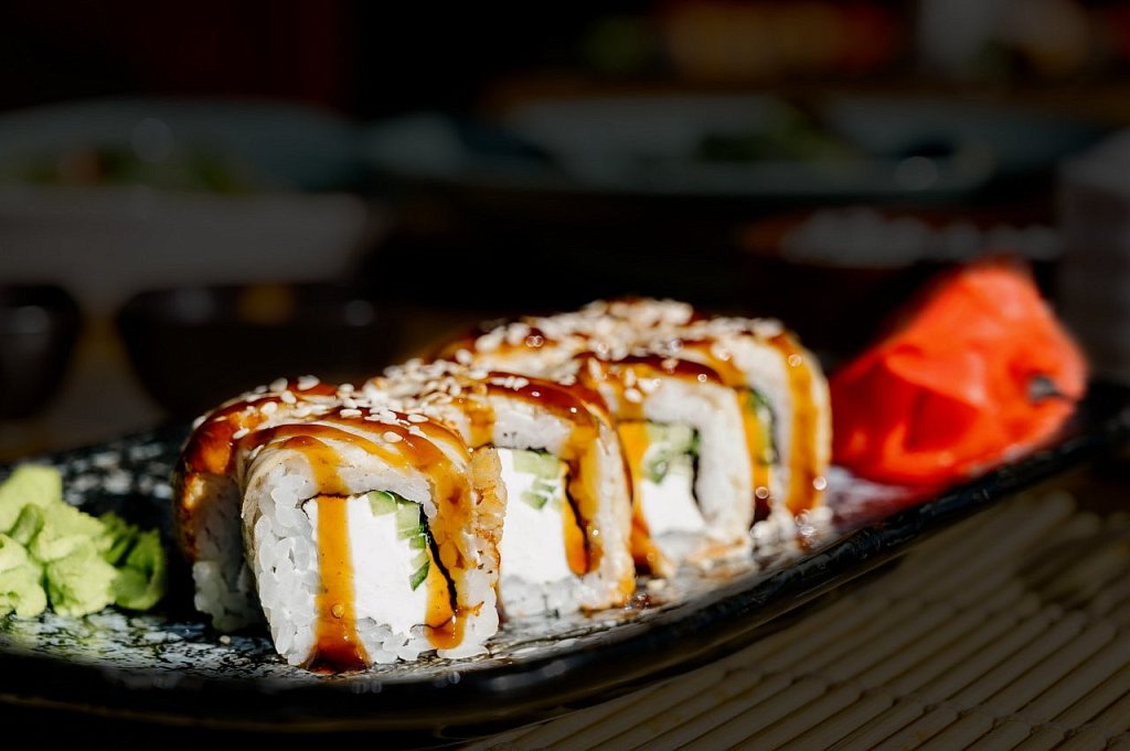 Состав: ролл касумики с авокадо, ролл цунаакай с гранатом, жаренный ролл Мидори с креветкой.