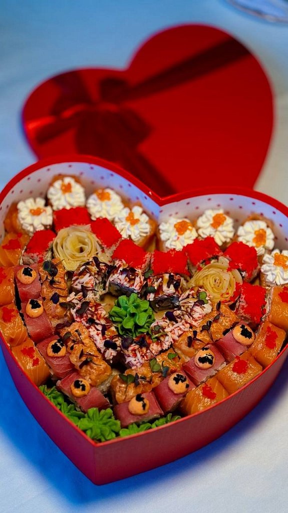 Состав: нори жареный в кляре, рис, сыр творожный, огурец, креветка, соус унаги, кунжут, икра тобико красная, лист бамбука.