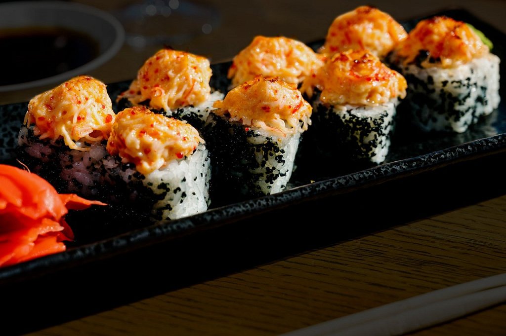 Состав: нори жареный в кляре, рис, сыр творожный, огурец, креветка, соус унаги, кунжут, икра тобико красная, лист бамбука.