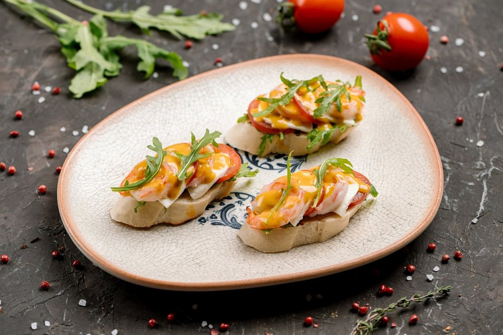 Состав: фирменный томатный соус, сыр моцарелла, мидии, креветки, кальмары, лосось, икра красная, сливки, перец болгарский, руккола