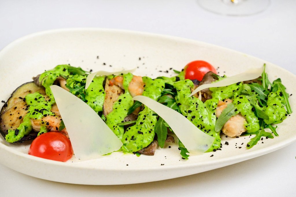 Состав: осьминог, осьминог бэби, кальмар, креветки, соус песто, сладкий чили, цветная капуста, маслины, оливки, лимон, тимьян