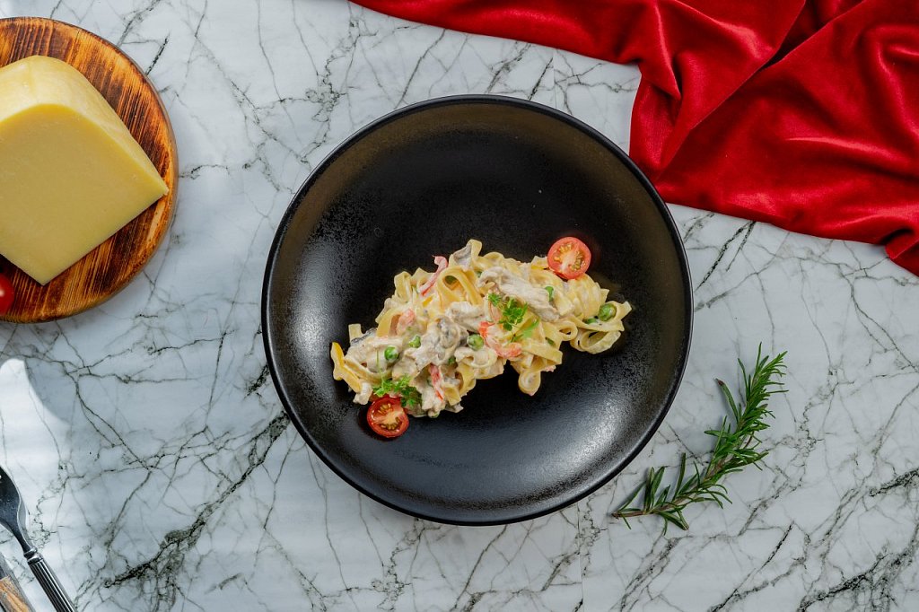 Вкусное описание: Ассорти из морепродуктов под нежным сливочном соусом.