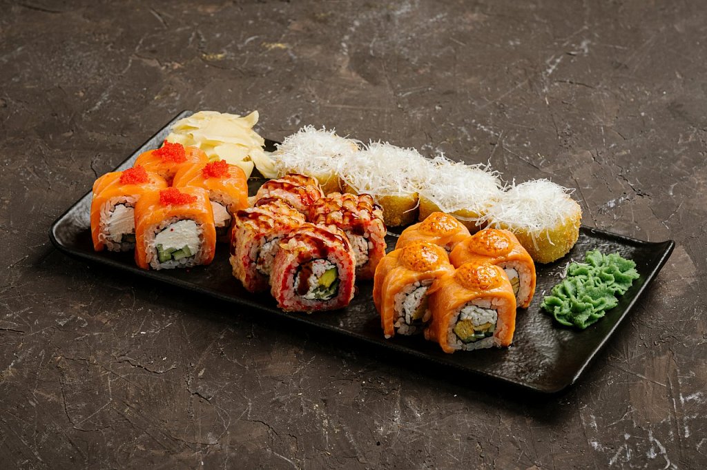 Состав: ролл касумики с авокадо, ролл цунаакай с гранатом, жаренный ролл Мидори с креветкой.