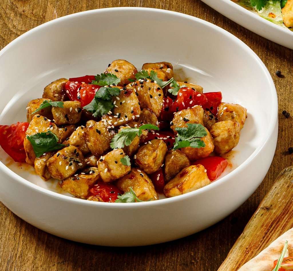 Состав: сливочный терияки соус, сыр моцарелла, индейка, болгарский перец, помидоры, руккола