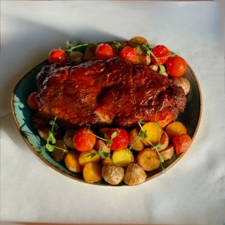 Свиная шейка под соусом Барбекю, картофель бейби, помидоры черри. Данное блюдо доступно по предзаказу за 2 дня