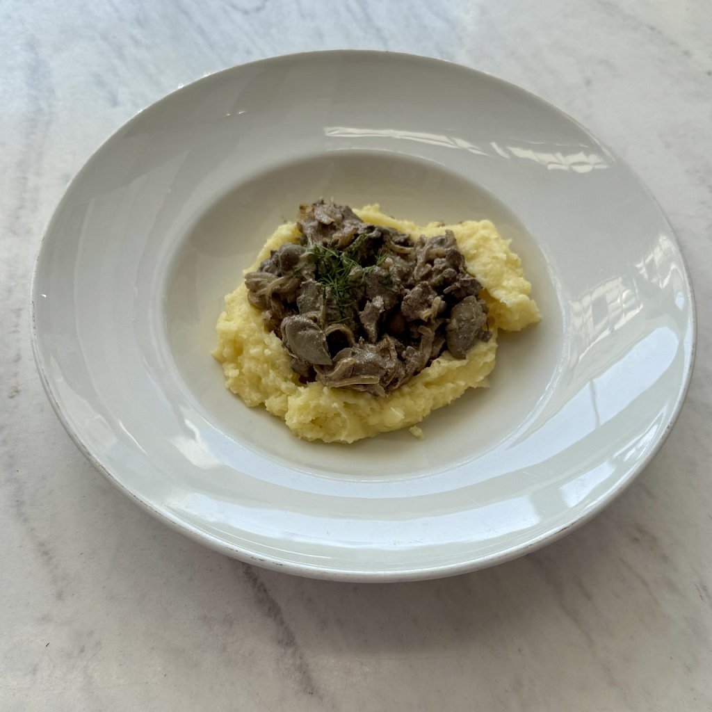 Состав: судак, грибы вешенки, грибы шампиньоны, картофель, сливки, соль, молотый перец.