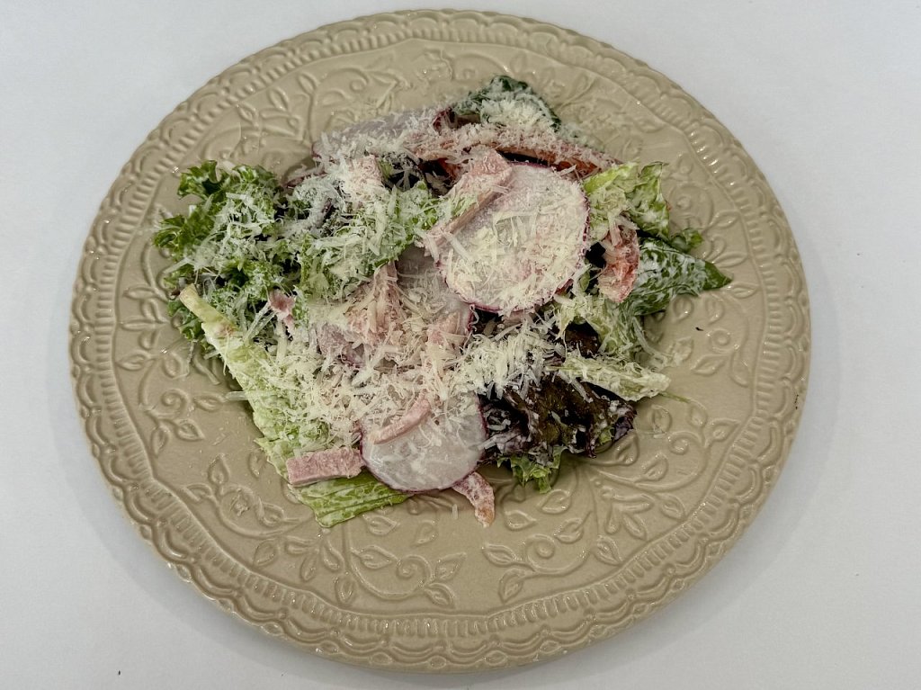 Состав: сливочный соус на основе пармезана сливок и куриного желтка, мортаделла, бекон,при подаче посыпаем сыром пармезан и украшаем шпинатом.