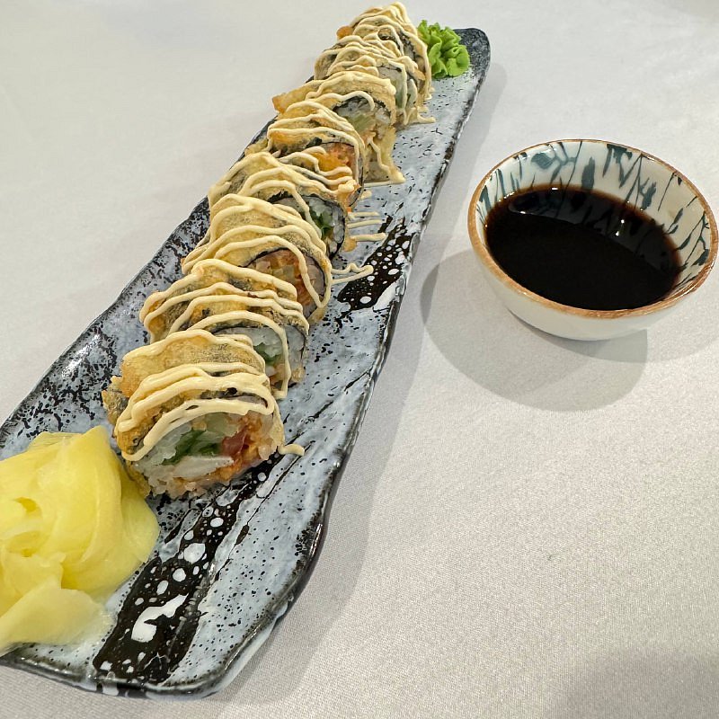 Состав: нори жареный в кляре, рис, сыр творожный, огурец, креветка, соус унаги, кунжут, икра тобико красная, лист бамбука.