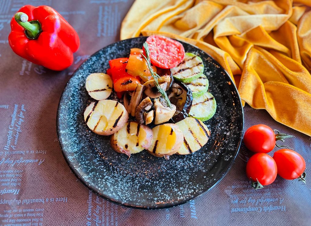 Обжаренные на гриле  стейк из индейки, куриной грудки, свиная  корейка, ростбиф, приготовленный методом сувид,  запеченные свиные  ребра  в соусе порто и говяжьи ребрышки, обжаренная утиная грудка подается с овощами-гриль( шампиньоны, кабачок, баклажаны, болгарский перец, картофель) и отдельно к блюду подаем соусы-сливочный с Дор блю и сливочный с демиглас. Вес 1900 гр.