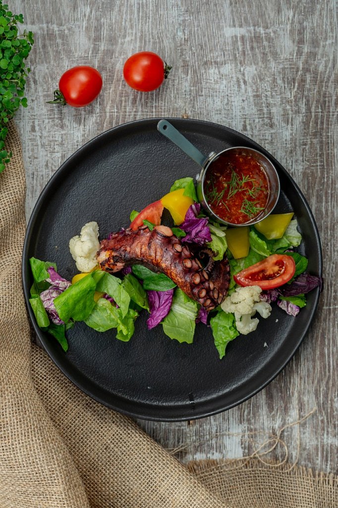 Состав: осьминог, картофель бэби, микс салата, помидоры, оливковое масло, лимон, сладкий чили