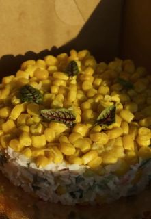 Мясо краба, кукуруза, яйцо, лук, огурцы свежие и соленые, яйцо, майонез, рис отварной, зелень.  Данное блюдо доступно по предзаказу за 2 дня