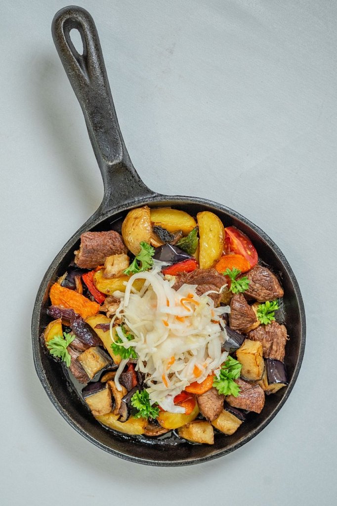 Состав: баранина, картофель бэби, болгарский перец, лук репчатый, морковь, зелень, грибы шампиньоны, квашеная капуста соль, черный перец, острый перец