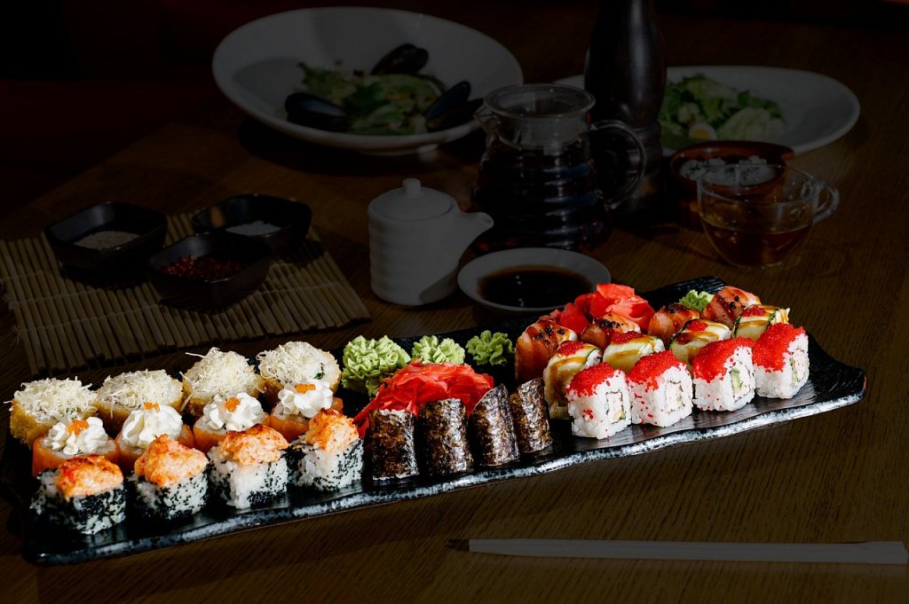 Состав: ролл касумики с авокадо, ролл цунаакай с гранатом, жаренный ролл Мидори с креветкой.