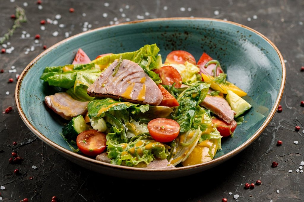 Состав: сливочный терияки соус, сыр моцарелла, индейка, болгарский перец, помидоры, руккола