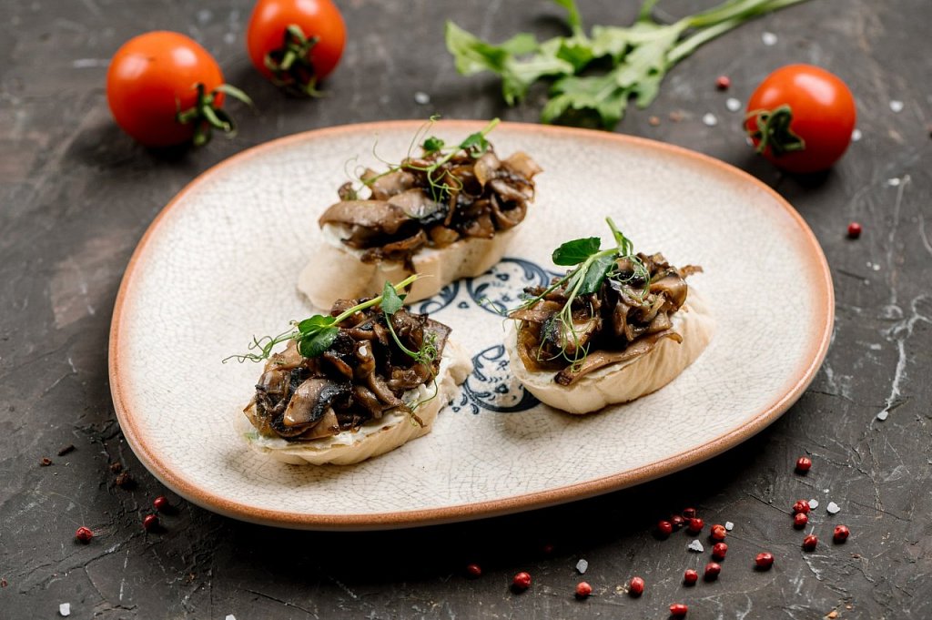 Состав: фирменный томатный соус, сыр моцарелла, ветчина, грибы шампиньоны, ассорти маринованных грибов, томаты, красный лук, руккола