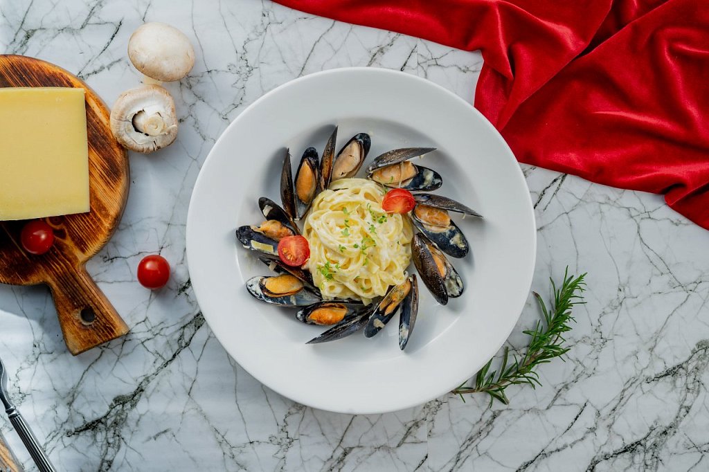 Состав: мидии, сливочный соус, пармезан, томаты черри, микрозелень.