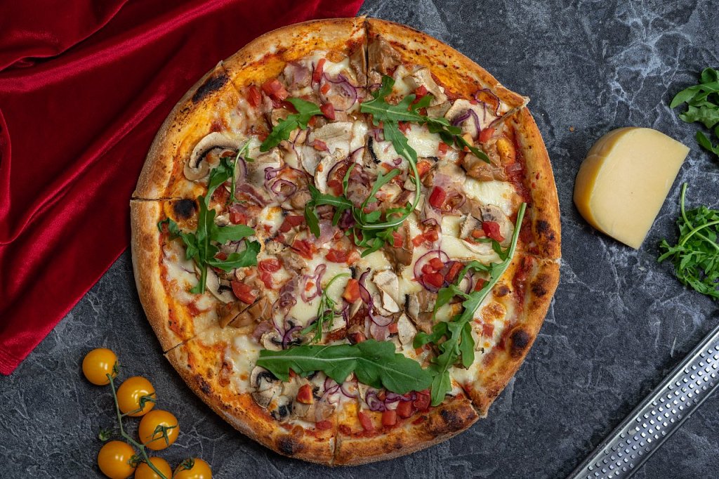 Состав: фирменный томатный соус, сыр моцарелла, ветчина, грибы шампиньоны, ассорти маринованных грибов, томаты, красный лук, руккола