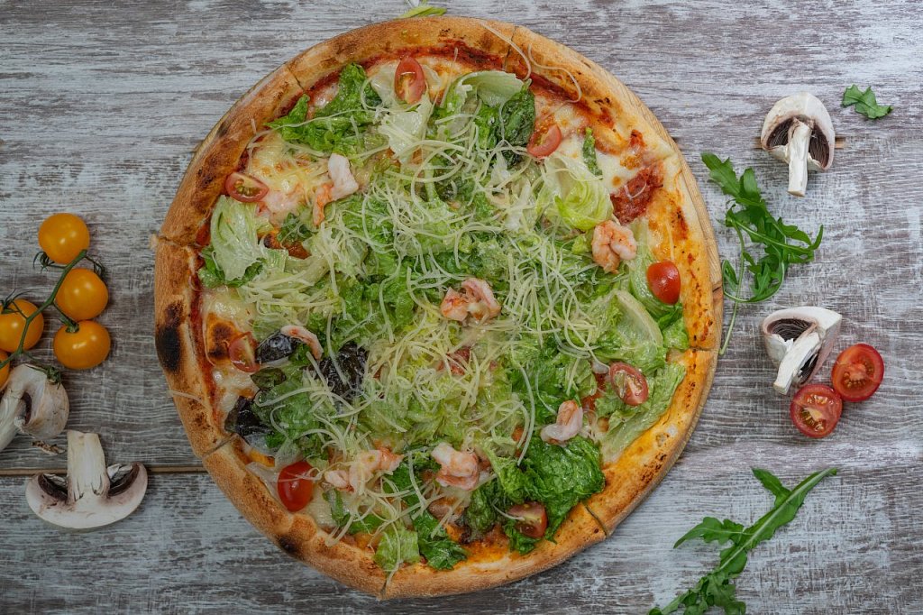Состав: фирменный томатный соус, сыр моцарелла, мидии, креветки, кальмары, лосось, икра красная, сливки, перец болгарский, руккола