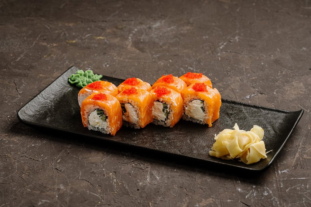Состав: нори жареный в кляре, рис, сыр творожный, огурец, креветка, соус унаги, кунжут, икра тобико красная, лист бамбука.
