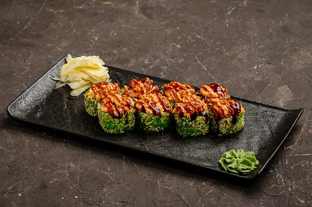 Состав: нори жареный в кляре, рис, сыр творожный, огурец, креветка, соус унаги, кунжут, икра тобико красная, лист бамбука.