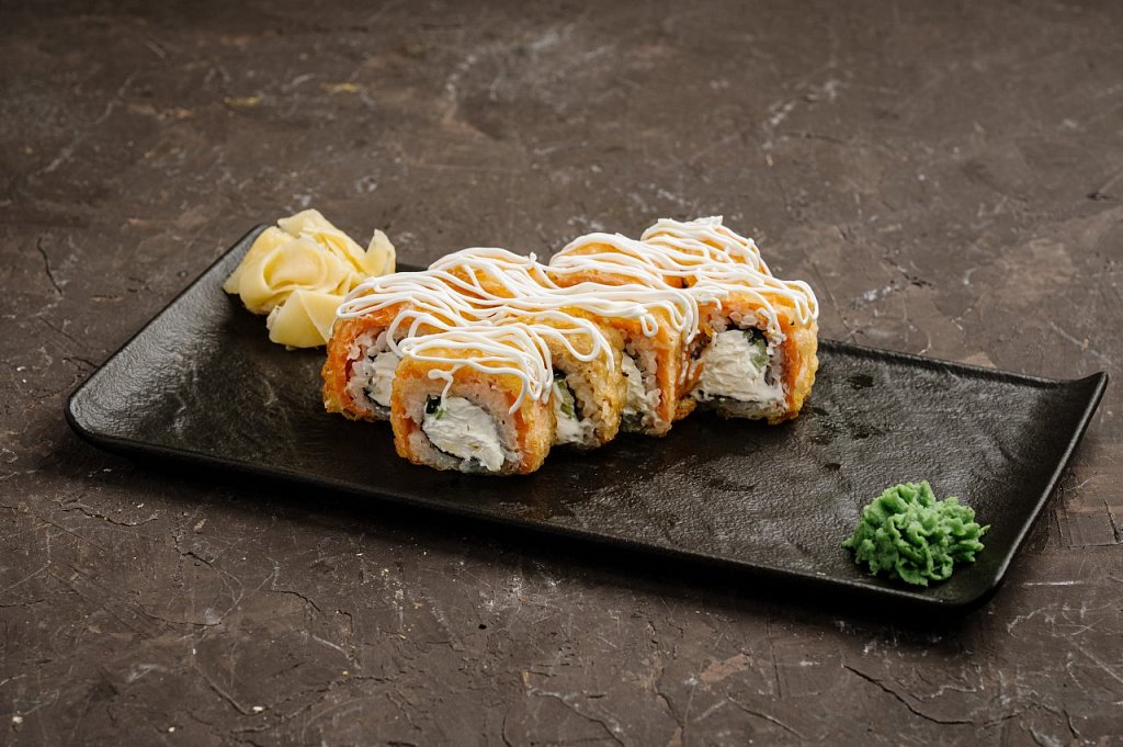 Состав: нори жареный в кляре, рис, сыр творожный, огурец, креветка, соус унаги, кунжут, икра тобико красная, лист бамбука.