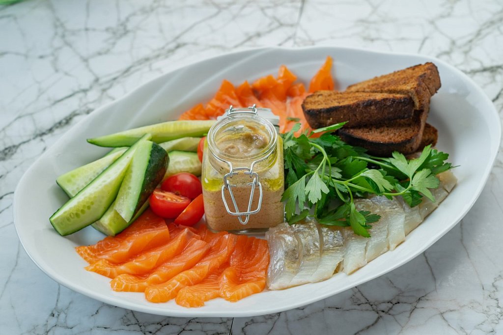 Состав: осьминог, осьминог бэби, кальмар, креветки, соус песто, сладкий чили, цветная капуста, маслины, оливки, лимон, тимьян