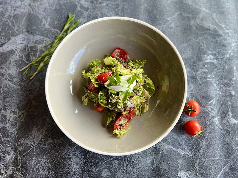 Состав: киноа, огурцы, помидоры, перец болгарский, сыр фетаки, авокадо, микс салата, лук красный, зелень, соус унаги, масло оливковое.