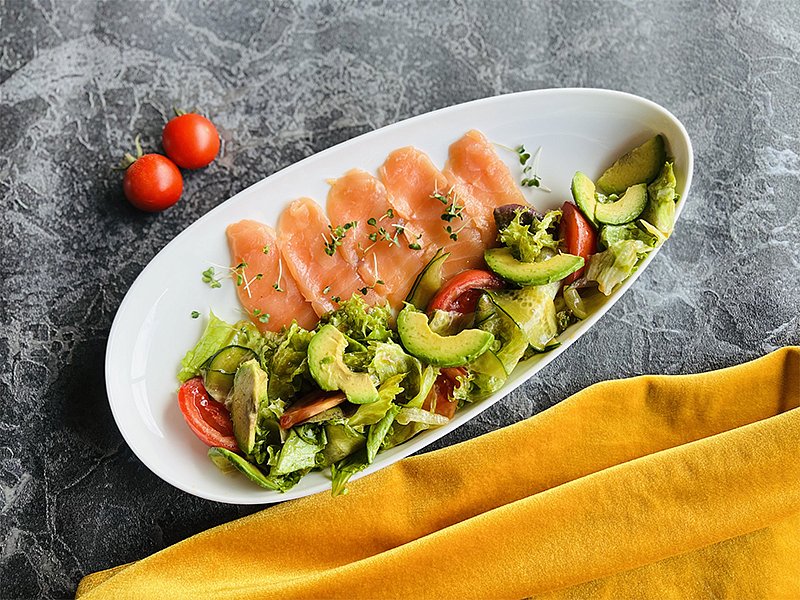 П С лососем, авокадо и миксом салата