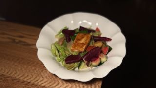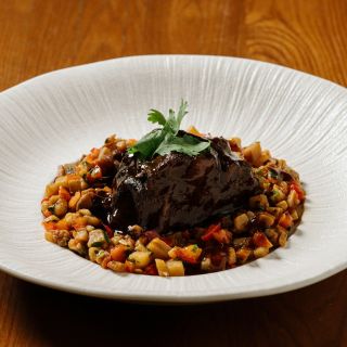 Говяжьи щечки обжариваются вместе с луком и морковью и тушатся три часа в соусе Деми- гляссе. Подаются с овощами аджапсандал: баклажан, кабачок, болгарский перец, помидор, винный уксус.
