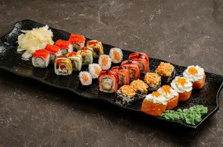 ½ Ролл «Горячий Цезарь», ½ Ролл «Мега Филадельфия», ½ Ролл «Калифорния», ½ Ролл «Мико», ½ Ролл «Акай», ½ Ролл «Просто с лососем», ½ Ролл «Дзераку- Гадзе»