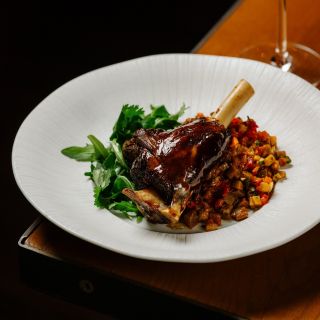 Голень баранины, приготовленная методом су-вид, глазируется соусом Деми-гляссе, медом, горчицей и подается с обжаренными овощами- баклажан, кабачок, болгарский перец, помидоры. В состав входит уксус винный и украшается кинзой