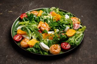 Состав: креветки, сыр пармезан, помидоры черри, яйцо перепелиное, микс салатов, чипсы из багета, фирменный соус