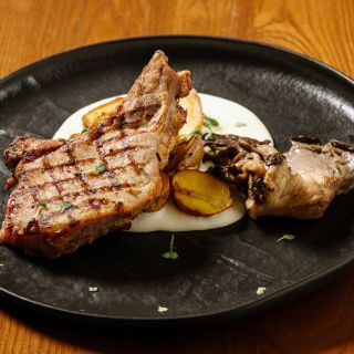 Состав: свиная корейка на кости гриль, подается с муссом (из картофеля, обжаренного с репчатым луком и сливками) и обжаренными на гриле вешенками и молодым картофелем.