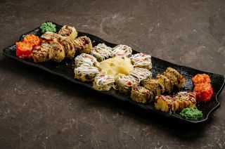 Состав: ролл Аге Маки, 1\2 ролл Токкобана, 1\2 ролл Накимура, 1\2 запеченный ролл с креветкой и угрем, 1\2 ролл Йокогама.
