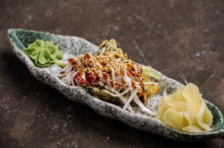 Состав: нори жареный в кляре, рис, соус спайс, огурец, соус унаги, кунжут, икра тобико красная, лист бамбука, снежный краб.