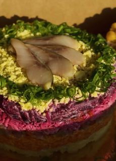 Сельдь, картофель, морковь, свекла, яйцо, лук, майонез, зелень. Данное блюдо доступно по предзаказу за 2 дня