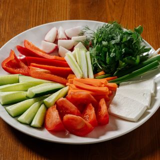 Состав: свежие огурцы, помидоры, болгарский перец, морковь, редис, стебель сельдерея, лук зеленый, кинза, петрушка, сыр фета.