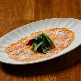 Тонко нарезанное филе лосося под соусом Понзу, посыпается Пармезаном