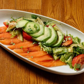 Состав: микс салата, свежие томаты, страчателла, слабосоленый лосось, оливковое масло.