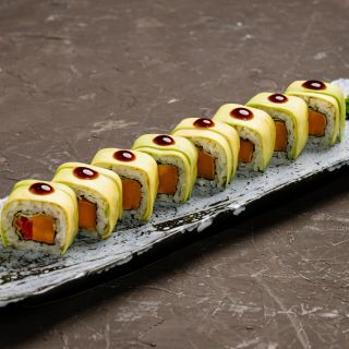 Состав: щупальца кальмара, рапаны, хвосты тигровых креветок, свежий огурец, болгарский перец, заправляется соусом унаги и оливковым маслом.