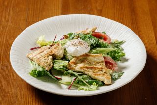 аппетитный салат на основе микса салата, филе курицы, редиса, свежих огурцов, томатов, каперсов, заправляется соусом укропный айоли и сверху украшается яйцом пашот..