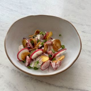 Состав : говяжья щека, пюре, микрозелень, соус на основе демигласа и соевого соуса.