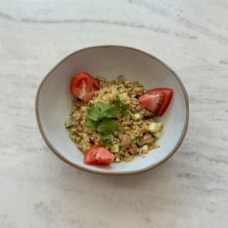 Состав: баклажан, помидоры, гранат, твороженный сыр, чеснок, зелень, микрозелень.