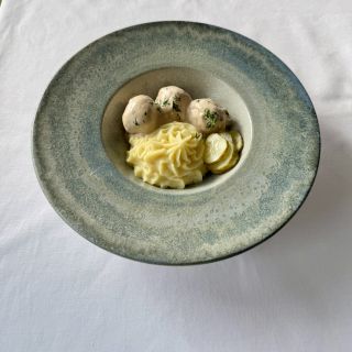Состав: кальмар, соус биск, микс салата, огурцы, помидоры, земля из маслин, тимьян, лимон, картофель, розмарин